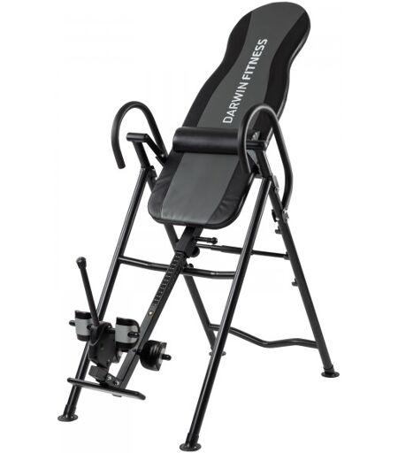 Stillingen "med hovedet nedad" på Darwin inversionstræner traktionsbænk tyngdekrafttræner anbefales af sportslæger og ortopæder til aflastning af rygsøjlens elastiske bruskskiver og til forebyggelse af rygsmerter og muskelspændinger. Kom op at hænge: At hænge med hovedet nedad aflaster... ...