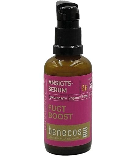 BenecosBIO Face Serum Hyaluronic Acid Moisture Boost er et anti-age serum, der er perfekt til en moden hud samt en hud, der kræver meget opmærksomhed. Dette serum har en virkelig let konsistens, der trænger lynhurtigt ind i huden, og efterlader den fugtet og næret. BenecosBIO Face Serum Hyaluronic Acid Moisture Boost er spækket med hyaluronsyre, der fylder hudens fine linjer med fugt og ikke mindst styrker kollagendannelsen, som øger hudens elasticitet. Derudover er BenecosBIO Face Serum Hyaluronic Acid Moisture Boost beriget med økologisk arganolie, der har en regenererende og beskyttende virkning på huden. Fordele: Serum Til moden og krævende hud Anti-age Styrker kollagendannelsen Fugtgivende Regenererende og beskyttende Øger hudens elasticitet Naturlige og økologiske ingredienser COSMOS certificeret Cruelty-free Naturlig duft Lavet af genbrugsplast Dermatologisk testet Genanvendelig Vegansk Anvendelse: Anvendes på afrenset hud Fordeles i hele ansigtet Massér forsigtigt ind i huden Ingrediensliste: AQUA, HORDEUM VULGARE STEM WATER, GLYCERIN, OLEA EUROPAEA FRUIT OIL, BENZYL ALCOHOL, ARGANIA SPINOSA KERNEL OIL, XANTHAN GUM, PRUNUS AMYGDALUS DULCIS OIL, VITIS VINIFERA SEED OIL, PARFUM, PUNICA GRANATUM FRUIT EXTRACT, SODIUM STEAROYL GLUTAMATE, HYALURONIC ACID, CITRIC ACID, PYRUS MALUS FRUIT EXTRACT, DEHYDROACETIC ACID, SODIUM BENZOATE, POTASSIUM SORBATE, LIMONENE, LINALOOL. ...
