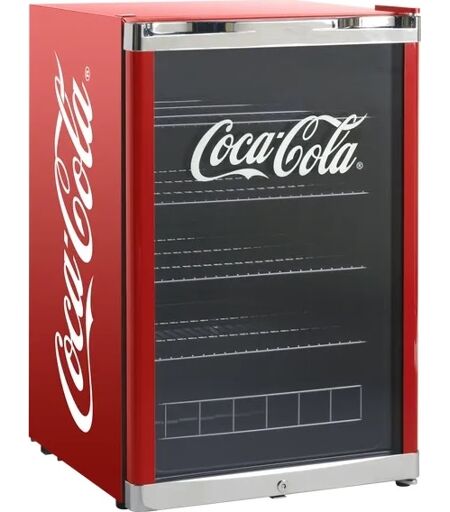 Coca-Cola Highcube GDE scandomestic køleboks Hvis kontoret, teenageværelset, værkstedet eller klubben trænger til at skinne lidt ekstra, så er et Coca Cola-køleskab et godt bud på et anderledes kølemøbel, der helt sikkert vil pynte i rummet og sætte kulør på hverdagen.Med Coca cola HighCube kan du opbevare masser af drikkevarer, ligesom du også kan opbevare snacks og madvarer. Scandomestic High Cube er på størrelse med andre små køleskabe, bare med det nostalgiske Coca Cola-design, den klassiske røde Coca Cola-farve, med det hvide Coca Cola-logo på siderne og på glasdøren. Køleskabet har et elegant, integreret kromhåndtag, som fuldender udseendet på det stilfulde køleskab. Døren leveres med et højrehængslet, men døren kan meget nemt vendes, så den bliver et venstrehængslet, hvilket gør det nemt og fleksibelt at placere skabet i rummet. I bunden af døren er der en lås, som gør det muligt at låse køleskabet, så døren ikke kan åbnes uden nøgle. Der medfølger to nøgler til skabet. Køleskabet er udstyret med 4 justerbare trådhylder, som er monteret med en afstand, så der er plads til at fylde skabet med både flasker, dåser og madvarer. I bunden er der en trådbøjle, som forhindrer f.eks. frugt i at rulle ud. Bøjlen kan nemt tages af. LED-belysning giver et flot lysindfald i det sorte kølerum. Specifikationer: Produktmål, HxBxD: 845 x 540 x 548 mm Bruttovolume, ltr: 130 Brand: Scandomestic Klassisk Coca Cola-design Vendbar dør med lås og nøgle Justerbare hylder Perfekt til kontorer, klubber og garager osv, Stilfuld kromdør med integreret håndtag Sort interiør og LED-lys Kapacitet 163 stk 33 cl, dåser (12x6,5 cm) ...