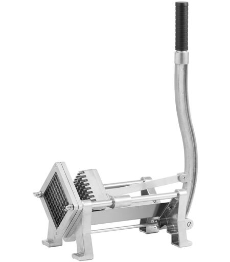 Denne kartoffelsnitter fra Royal Catering gør det nemt at skære kartofler eller andre grøntsager og frugter i ensartede, lige stave. Kartoffelsnitteren betjenes manuelt med håndtaget. Grøntsagerne eller frugterne placeres i holderen og skubbes med det rutsjesikre gummigreb hen mod de skarpe klinger. Der medfølger tre knivenheder med målene 84 x 84 mm. Grøntsagspindene måler 8 x 8 mm, 10 x 10 mm eller 12 x 12 mm. Knivenhederne udskiftes så nemt som ingenting. Det rustfri stål af høj kvalitet garanterer lige skærekanter med kartofler, kålrabi, æbler eller zucchini. Med hullerne i fødderne kan man fastmontere denne pommes frites-maskine pladsbesparende til væggen. Denne monteringsform er hurtig og effektiv hvis man placerer en skål under pommes frites-jernet. Den kan selvfølgelig også monteres vandret på arbejdsbordet. Kartoffelsnitteren er konstrueret af rustfrit stål, aluminium og stål som er robust og modstandsdygtigt. Med de glatte overflader, afrundede kanter og aftagelige knivenheder er det nemt at opvaske dette pommes frites-jern grundigt under rindende vand. Knivenhederne tåler opvaskemaskine. ...