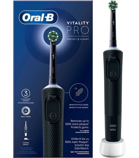 Oral-B Vitality Pro genopladelig elektrisk tandbørste tilbyder klinisk bekræftet overlegen rengøring sammenlignet med traditionelle manuelle tandbørster. Vitality Pro har 3 børstningsprogrammer: Daglig rengøring, Følsom og Følsom-Plus for en utrolig blid tandbørstningsoplevelse. Timeren i håndstykket hjælper med at overholde tandlægens anbefalede rengøringstid på 2 minutter. Grundig rengøring takket være 2D-teknologi. Grønne børstehår bliver gule, når det er tid til at skifte børstehoved. ...