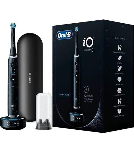 Den elektriske iO 10-tandbørste med den revolutionerende iO Sense-ladestation giver feedback i realtid for en effektiv og behagelig børstningsoplevelse. Den kombinerer blide mikrovibrationer med Det unikke, runde børstehoved fra Oral-B og sikrer dermed følelsen af professionel tandrensning hver dag. Det anbefales at skifte clip-on børste på Oral-B iO tandbørsten hver 3. måned for de bedste resultater. Den magnetiske iO Sense ladestation tilbyder individualiseret live coaching, så du ved, hvornår og hvordan du rengør. 3D tandsporing med kunstig intelligens registrerer børstningsadfærden på ydersiden, indersiden og tyggefladen - for optimal rengøring. Med det interaktive farvedisplay kan du skifte mellem rengøringsprogrammerne og blive mindet om børstehovedskiftet. Den intelligente trykregulering lyser rødt, når der er for meget tryk, hvidt, når der er for lidt tryk og angiver med grønt lys, hvornår det optimale tryk er brugt. ...