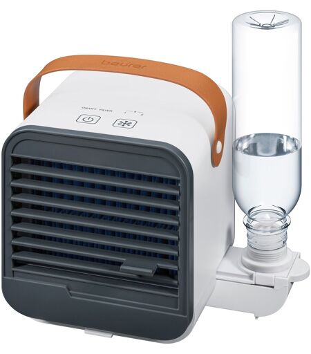 Den kompakte og stilfulde LV 50 Fresh Breeze bordventilator giver en frisk brise på kontoret, hjemmekontoret eller i dine stuer. Med det praktiske bærehåndtag er bordventilatoren kun et håndtag væk. LV50 Fresh Breeze suger den tørre varme luft i rummet ind, som derefter møder fordampningsfilteret suget fuld af vand. På grund af kontakten mellem luftstrømmen og den fugtige filteroverflade fordamper vandet. Rumluften absorberer fugtigheden. I processen ekstraheres den varmeenergi, der er nødvendig til fordampning, fra rumluften. Den håndgribelige temperatur i rumluften falder. ...