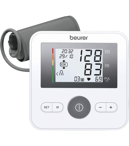 Den hvide blodtryksmåler BEURER BM 27+ overarm bruges til at måle og overvåge arterielle blodtryksværdier og er en nyttig tilføjelse til dit medicinskab! Den 22 - 42 cm lange manchet kan bruges af næsten alle. Målingen foregår på overarmen. Det gennemsnitlige blodtryk vises for dig her. Blodtryksmåleren kan også vise klokkeslæt og dato. Et LCD-display viser dig alle de bestemte værdier. Måleinstrumentet kan endda registrere en hjertearytmi og informerer dig i tilfælde af en uregelmæssighed. Du kan genkende slutningen af målingen ved en signaltone. Enheden slukker af sig selv efter en forudbestemt tid. Denne automatiske slukning beskytter batterierne. Vil du holde øje med dit blodtryk? Så er BM 27+ overarmsblodtryksmåleren fra BEURER et godt valg. ...