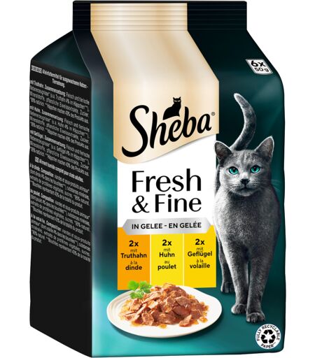 12x50g Fresh & Fine - Kalkun, Kylling & Fjerkræ i Gelé Fiskevariation i sauce Sheba kattemad