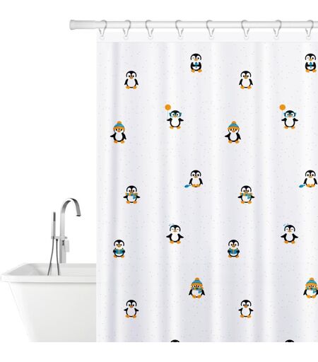 Det sjove badeforhæng Funny Penguins fra Tatkraft har et pingvinmotiv, der ikke kun bringer en glad farve til dit badeværelse, det er også ekstra praktisk, da det har magneter i hjørnerne, der holder det på plads, mens du bader. Magneterne forhindrer vand i at komme på gulvet, og at forhænget blæser op og klæber til dig. Badeforhænget er 180 x 180 cm og er velegnet til de fleste standard badekar og brusere. Det leveres også med 12 ringe til bruseforhæng. - Sjovt bruseforhæng med et pingvinmotiv - Badeforhænget har magneter i hjørnerne - Leveres med 12 ringe til bruseforhæng Specifikationer: Farve: Flerfarvet Materiale: Polyester Mål: 180 x 180 cm Pakken Indeholder: 1x Badeforhæng 12x Ringe til Badeforhæng Produktet leveres i originalemballage. ...
