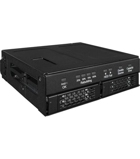 ToughArmor RAID 1 / JBOD MB902SPR-B R1 er et robust mobilt rack i metal med to båse, der understøtter 2 x 2,5" SATA-harddiske eller SSD''er i en enkelt 5,25" drevplads på dit computer-/arbejdsstationssystem. Med det indbyggede hardware-RAID-chipsæt og letlæselige RAID-status-LED''er kan du nemt spejle 2,5"-drevene for dataredundans uden at skulle installere et RAID-kort eller RAID-overvågningssoftware på værtssiden. Desuden er processoren (CPU''en) normalt nødvendig for at skabe en RAID, men RAID-chipsættet i kabinettet frigør CPU''en fra denne overhead og fremskynder hele systemet. Derfor er MB902SPR-B R1 et perfekt aftageligt rack til missionskritiske computersystemer, der ikke kun får dit system til at arbejde hurtigere, men også giver beskyttelse af dine kritiske data. ToughArmor MB902SPR-B R1 understøtter 7-bens SATA-data og 15-bens strømkabler med holdeclips, så du ikke behøver at bekymre dig om, at kabler utilsigtet løsner sig fra kabinettet. Når kablerne er tilsluttet, forbliver de på plads. ...