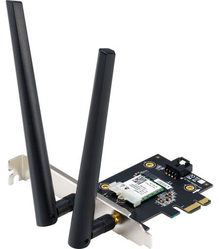 ASUS PCE-AXE5400 er en WiFi 6E PCIe-adapter med 2 eksterne antenner. ASUS PCE-AXE5400 understøtter 6 GHz-bånd, 160 MHz, Bluetooth 5.2, WPA3-netværkssikkerhed, OFDMA og MU-MIMO. Ved at bruge 6 GHz-båndet oplever brugerne mindre overbelastning og interferens til Wi-Fi-forbindelser. ...