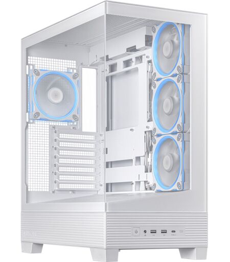 ASUS A31 PLUS er et pc-etui, der er designet til minimalistiske almindelige gør-det-selv-pc''er. Den understøtter en bred vifte af AIO-kølere og grafikkort og kan nemt rumme bundkort med skjulte stik for at give en ren, overskuelig opsætning. Etuiet er ikke kun kompatibelt med ROG MAXIMUS Z790 HERO BTF, men også med ROG MAXIMUS Z790 HERO BTF, et bundkort med innovative skjulte stik og headere i bunden, der giver mulighed for ren kabelhåndtering. A31 PLUS ATX-kabinettet understøtter op til 360 mm radiatorer, grafikkort op til 380 mm lange og CPU-luftkølere op til 165 mm høje, hvilket giver hobbyfolk masser af muligheder, når de sammensætter deres næste pc. Den tilbyder 80 mm frihøjde til AIO-kølere øverst, hvilket gør det muligt at bruge tykkere radiatorer og større blæsere. Fire forudinstallerede ARGB-blæsere forbedrer også køleydelsen. Fodens 8° vinkel kombinerer funktionalitet og elegance, fremmer effektiv køling og giver et bredere udsyn for maksimal fordybelse. Basisdesignet er også ideelt til at fremvise dit systems personlige stil og ARGB-effekter. ...