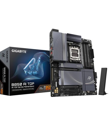 GIGABYTE B850 AI TOP er baseret på AMD B850-chipsættet og understøtter AMD-processorer til socket AM5. Den har fire DDR5-slots til op til 256 GB RAM. Andre funktioner i GIGABYTE B850 AI TOP inkluderer en PCIe 5.0 x16-slot og to PCIe 4.0 x16-slots. Derudover har GIGABYTE B850 AI TOP 8-kanals lyd, et 2.5 Gigabit LAN-interface, ti SATA3-porte, WiFi7, Bluetooth, tre M.2-porte og en række USB-porte. ...
