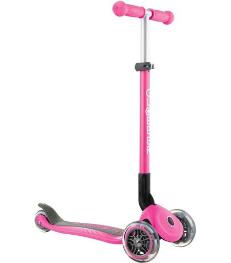Primo Foldable - den trehjulede børnescooter med farvestrålende forhjul er især populær blandt forældre, der leder efter funktionalitet og sikkerhed for deres små. Med en hjuldiameter på 120 mm foran og 80 mm bagpå, høje rebound-hjul støbt af PU og rullende på ABEC 5 kuglelejer, tilbyder denne scooter stor kørekomfort. Den robuste friktionsbremse bagpå bremser pålideligt selv under hurtige ture Det ekstra dybe, forstærkede dæk med skridsikker slidbane giver optimalt greb og et sikkert stativ. Den omskiftelige styrelås fastgør styresystemet på de to forhjul, så scooteren kun bevæger sig frem og tilbage. På den måde lærer børnene sikkert, nemt og hurtigt. Det aftagelige, farveanodiseret aluminiumsstyr er 3-vejs højdejusterbart og udstyret med en hurtigudløser og sikkerhedslås. Så Primo Foldable vokser simpelthen med dig med tiden! Og når den ikke er i brug, kan den nemt gemmes væk med sin praktiske foldemekanisme og trækkes i trolley-tilstand. ...
