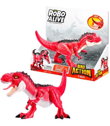Denne T-Rex er virkelig "levende": Hvis halen røres, klør den sit bytte med armene, og kæben åbnes. Dermed producerer den en skræmmende dinosaurlyd. Her skal du holde afstand, for denne T-Rex med den røde hud, de skræmmende tænder og tungen, der stikker bredt ud, ser virkelig farlig ud! ...