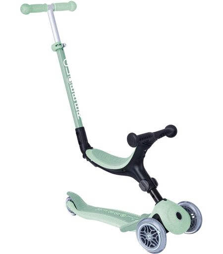 Go-Up Foldable Plus Eco fra Globber er den ultimative 3-i-1 scooter til småbørn og børn. Dette sammenklappelige trehjulede løbehjul med sæde vokser med barnet og forvandles ubesværet til en trehjulet cykel, løbecykel eller scooter. Tilstandene "Mount" og "Run" er perfekte til småbørn i alderen 15 til 36 måneder, mens Scooter-tilstanden vil glæde børn fra 3 år og derover. TPR-sædet kan justeres i højden på 2 måder og kan justeres uden værktøj med et tryk på en knap. Styret er 3-vejs højdejusterbart. Go-Up Foldable Plus Eco er udstyret med et ekstra dybt, forstærket og skridsikkert kompositdæk, der understøtter op til 50 kg. Den har højkvalitets 120 mm støbte PU-forhjul monteret på ABEC 5 kuglelejer. Derudover er der et 80 mm baghjul lavet af PU-støb. Den optimerede og ekstra brede friktionsbremse bagtil sikrer pålidelig bremsning, og der medfølger en aftagelig fodstøtte for ekstra komfort og sikkerhed i køretilstand. Med sit praktiske foldesystem kan Go-Up Foldable Plus Eco også nemt transporteres. Styret kan justeres i højden fra 68-78 cm. Go-Up Foldable Plus Eco er fremstillet af 100 % genbrugsplast (GRS) og biologisk nedbrydeligt hvedehalm. ...