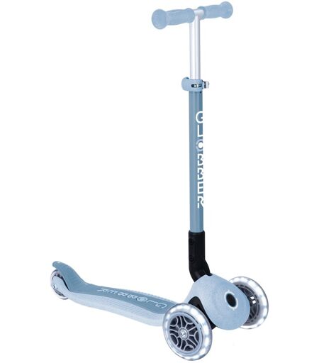 Primo Foldabe Plus Lights Eco - en 3-hjulet børnescooter med oplyste forhjul, patenteret foldemekanisme og trolley-tilstand, som overbeviser med funktionalitet og nem håndtering. Derudover er der den mere miljøvenlige produktionsmetode for denne scooter, som består af 60% genbrugsplast (GSR) og biologisk nedbrydelige halmfibre. Primo løbehjul fra GLOBBER er de ideelle løbehjul til børn fra 3 år, da de understøtter at lære at køre med styreindgrebet og sikrer sikker køreglæde. Køreglæden forsømmes heller ikke: Primo Foldable Plus Lights Eco har en hjuldiameter på 120 millimeter foran og en diameter på 80 millimeter bagpå. De PU-støbte hjul ruller ekstremt let med ABEC 5 kuglelejer. LED-forhjulene skaber en kølig, glødende effekt under kørsel med batterifri dynamoteknologi og er et ægte blikfang. Jo hurtigere turen er, jo stærkere lyser lyset! Den ekstra brede friktionsbremse bagtil sikrer et sikkert stop, selv når du kører ved høje hastigheder. Det ekstra dybe, forstærkede deck med 2-farvet skridsikker slidbane giver godt greb og et sikkert stativ. Den omskiftelige styrelås fastgør styresystemet på de to forhjul, så scooteren kun bevæger sig frem og tilbage. Primo Foldable Plus Lights Eco vokser med dig: Det aftagelige, farveanodiseret aluminiumsstyr er 3-vejs højdejusterbart mellem 68-78 cm og udstyret med en quick release, TPR-sikkerhedsgreb og sikkerhedslås. ...