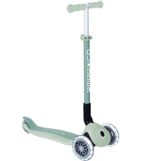 Primo Foldabe Plus Lights Eco - en 3-hjulet børnescooter med oplyste forhjul, patenteret foldemekanisme og trolley-tilstand, som overbeviser med funktionalitet og nem håndtering. Derudover er der den mere miljøvenlige produktionsmetode for denne scooter, som består af 60% genbrugsplast (GSR) og biologisk nedbrydelige halmfibre. Primo løbehjul fra GLOBBER er de ideelle løbehjul til børn fra 3 år, da de understøtter at lære at køre med styreindgrebet og sikrer sikker køreglæde. Køreglæden forsømmes heller ikke: Primo Foldable Plus Lights Eco har en hjuldiameter på 120 millimeter foran og en diameter på 80 millimeter bagpå. De PU-støbte hjul ruller ekstremt let med ABEC 5 kuglelejer. LED-forhjulene skaber en kølig, glødende effekt under kørsel med batterifri dynamoteknologi og er et ægte blikfang. Jo hurtigere turen er, jo stærkere lyser lyset! Den ekstra brede friktionsbremse bagtil sikrer et sikkert stop, selv når du kører ved høje hastigheder. Det ekstra dybe, forstærkede deck med 2-farvet skridsikker slidbane giver godt greb og et sikkert stativ. Den omskiftelige styrelås fastgør styresystemet på de to forhjul, så scooteren kun bevæger sig frem og tilbage. Primo Foldable Plus Lights Eco vokser med dig: Det aftagelige, farveanodiseret aluminiumsstyr er 3-vejs højdejusterbart mellem 68-78 cm og udstyret med en quick release, TPR-sikkerhedsgreb og sikkerhedslås. ...