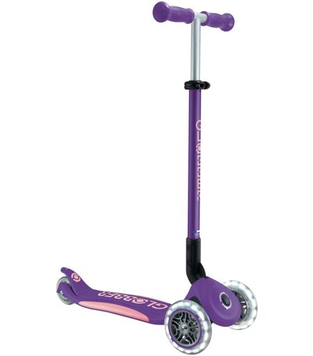 Primo Foldabe Plus Lights - en 3-hjulet børnescooter med oplyste forhjul, patenteret foldemekanisme og trolley-tilstand, som overbeviser med funktionalitet og nem håndtering. Primo løbehjul fra GLOBBER er de ideelle løbehjul til børn fra 3 år, da de understøtter at lære at køre med styreindgrebet og sikrer sikker køreglæde. Køreglæden forsømmes heller ikke: Primo Foldable Plus Lights har en hjuldiameter på 120 millimeter foran og en diameter på 80 millimeter bagpå. De PU-støbte hjul ruller ekstremt let med ABEC 5 kuglelejer. LED-forhjulene skaber en kølig, glødende effekt under kørsel med batterifri dynamoteknologi og er et ægte blikfang. Jo hurtigere turen er, jo stærkere lyser lyset! Den ekstra brede friktionsbremse bagtil sikrer et sikkert stop, selv når du kører ved høje hastigheder. Det ekstra dybe, forstærkede deck med 2-farvet skridsikker slidbane giver godt greb og et sikkert stativ. Den omskiftelige styrelås fastgør styresystemet på de to forhjul, så scooteren kun bevæger sig frem og tilbage. Primo Foldable Plus Lights vokser med dig: Det aftagelige, farveanodiseret aluminiumsstyr er 4-vejs højdejusterbart mellem 68-83 cm og udstyret med en hurtigudløser, TPR-sikkerhedsgreb og sikkerhedslås. ...