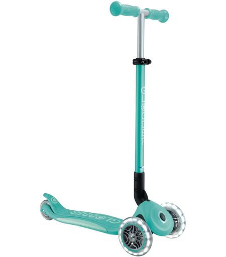 Primo Foldabe Plus Lights - en 3-hjulet børnescooter med oplyste forhjul, patenteret foldemekanisme og trolley-tilstand, som overbeviser med funktionalitet og nem håndtering. Primo løbehjul fra GLOBBER er de ideelle løbehjul til børn fra 3 år, da de understøtter at lære at køre med styreindgrebet og sikrer sikker køreglæde. Køreglæden forsømmes heller ikke: Primo Foldable Plus Lights har en hjuldiameter på 120 millimeter foran og en diameter på 80 millimeter bagpå. De PU-støbte hjul ruller ekstremt let med ABEC 5 kuglelejer. LED-forhjulene skaber en kølig, glødende effekt under kørsel med batterifri dynamoteknologi og er et ægte blikfang. Jo hurtigere turen er, jo stærkere lyser lyset! Den ekstra brede friktionsbremse bagtil sikrer et sikkert stop, selv når du kører ved høje hastigheder. Det ekstra dybe, forstærkede deck med 2-farvet skridsikker slidbane giver godt greb og et sikkert stativ. Den omskiftelige styrelås fastgør styresystemet på de to forhjul, så scooteren kun bevæger sig frem og tilbage. Primo Foldable Plus Lights vokser med dig: Det aftagelige, farveanodiseret aluminiumsstyr er 4-vejs højdejusterbart mellem 68-83 cm og udstyret med en hurtigudløser, TPR-sikkerhedsgreb og sikkerhedslås. ...