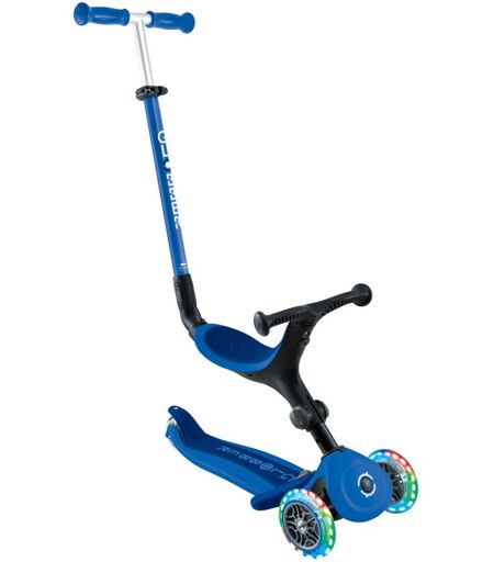 Go-Up Active Lights fra Globber er det ultimative 3-i-1 løbehjul til småbørn og børn. Denne oplyste sammenklappelige trehjulede scooter med sæde vokser med barnet og forvandles ubesværet til en trehjulet cykel, løbecykel eller scooter. Tilstandene "Mount" og "Run" er perfekte til småbørn i alderen 15 til 36 måneder, mens Scooter-tilstanden vil glæde børn fra 3 år og derover. TPR-sædet kan justeres i højden på 2 måder og kan justeres uden værktøj med et tryk på en knap. Styret er 4-vejs højdejusterbart. Go-Up Active Lights er udstyret med et ekstra dybt, forstærket og skridsikkert kompositdæk, der understøtter op til 50 kg. Den har batterifrie LED-pærer af høj kvalitet i de 120 mm støbte PU-forhjul, som blinker i rødt, grønt og blåt og er monteret på ABEC 9-lejer. Derudover er der et 80 mm baghjul lavet af PU-støb. Den optimerede og ekstra brede friktionsbremse bagtil sikrer pålidelig bremsning, og der medfølger en aftagelig fodstøtte for ekstra komfort og sikkerhed i køretilstand. Med det praktiske foldesystem kan Go-Up Active Lights også nemt transporteres. Styret kan justeres i højden fra 68-83 cm. ...