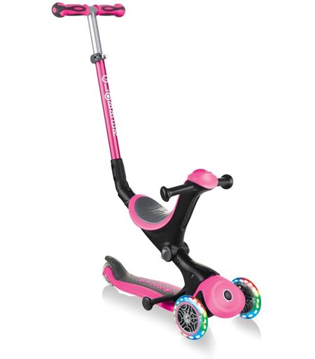 Go-Up Deluxe Lights fra Globber er et rigtigt alt-i-et børnekøretøj: trehjulet cykel, balancecykel og scooter med farvestrålende forhjul, foldemekanisme og trolley-tilstand! Det innovative design tilpasser sig barnets udvikling. Go-Up Deluxe Lights kan bruges som trehjulet cykel med skubbestang, som løbecykel og også som scooter og kan omdannes til de forskellige køretøjer uden værktøj. I scootertilstand kan Go-Up Deluxe Lights nemt foldes sammen og nemt trækkes i. Med en hjuldiameter på 120 mm foran og 80 mm bagpå, højrebound-hjul lavet af PU- og ABEC 5-lejer, tilbyder Go-Up Deluxe Lights masser af ubekymret køreglæde på tre hjul. LED-forhjulene skaber en permanent farverig glødende effekt under kørslen - batterifrit med dynamoteknologi. Jo hurtigere turen er, jo stærkere lyser LED-lysene! Maksimal kørekomfort tilbydes af det 3-vejs højdejusterbare, særligt bløde og ekstra brede TPR-sæde. De komfortable fodstøtter er nemme at fjerne. Den omskiftelige styrelås fikserer styresystemet på de to forhjul, så Go-Up Deluxe Lights kun bevæger sig frem og tilbage, og børn kan lære at køre endnu hurtigere. Det ekstra dybe, forstærkede dæk med 2-farvet skridsikker slidbane sikrer et godt fodfæste. En ekstra bred bageste friktionsbremse er installeret for sikker bremsning til enhver tid. ...
