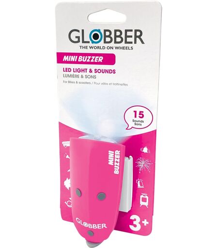 Mini Buzzer fra GLOBBER er et hvidt glødende, batteridrevet LED-lys og klokke i ét! De tre lysindstillinger kan justeres individuelt til konstant lys, blinkende eller hurtigt blinkende. Derudover er der lydfunktionen med et bredt udvalg af 15 lyde: Uanset om det er cykelklokke, fyrværkeri, Dixie-horn, prut, hooter, laser, magisk tæppe, magi, gammel trompet, politibil, racerbil, bakvogn, tog eller ulv - alle lyde er også sjove og høje! Minisummeren fastgøres nemt til løbehjulet, løbecyklen eller cyklen med en justerbar silikonestrop. Den drives af 2 medfølgende AAA-batterier. Den drives af 2 medfølgende AAA-batterier og har ikke StVZO-godkendelse. ...