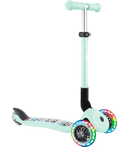 Med Junior Foldabe Fantasy Lights fra Globber kommer børn fra to år op i fart: Denne scooter står på tre polyurethanhjul og har ABEC 5 kuglelejer. De forreste hjul lyser batterifrit, styret kan justeres til tre højder. Dette kan styres via styrets vippebevægelse, som er udstyret med ergonomiske TPR-håndtag. På det skridsikre dæk finder selv små fødder et sikkert fodfæste - friktionsbremsen på baghjulet decelererer pålideligt. For nem transport er denne scooter foldbar eller kan trækkes i vogntilstand. ...