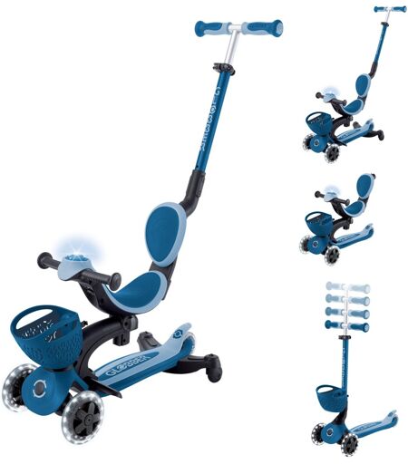 Go-Up Baby Lights 360 fra GLOBBER indeholder et specielt baghjulsmodul til særlig let 360° styring via trykstang. Dette børnekøretøj er en ride-on cykel, løbecykel og scooter med en patenteret foldemekanisme og trolley-tilstand i ét. Det innovative design med vibrationsstyret LED-lysmodul på styret (kun i ride-on- og balancebike-tilstand) kombinerer ren køreglæde med funktionalitet og tilpasser sig barnets udvikling. Go-Up Baby Lights 360 kan ombygges til de forskellige køretøjer uden værktøj. Med en hjuldiameter på 120 mm foran og 80 mm bagpå, hjul med høj rebound af PU og ABEC 9 kuglelejer er det muligt at køre ubekymret på tre hjul. LED-forhjulene skaber en kølig, glødende effekt under kørsel med batterifri dynamoteknologi. Maksimal komfort leveres af ryglænet og det 3-vejs højdejusterbare, særligt bløde og ekstra brede TPR-sæde, som nemt og sikkert kan justeres til barnets størrelse. Den omskiftelige styrelås fikserer styresystemet på de to forhjul, så Go-Up Baby Lights 360 kun kan bevæge sig fremad og bevæge sig. Det ekstra dybe, forstærkede dæk med 2-farvet skridsikker slidbane sikrer et godt fodfæste. For sikker bremsning er der monteret en ekstra bred friktionsbremse bagtil. Fodstøtten i ride-on-tilstand kan nemt fjernes med en drejeknap. ...