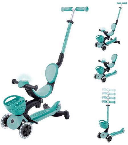 Go-Up Baby Lights 360 fra GLOBBER indeholder et specielt baghjulsmodul til særlig let 360° styring via trykstang. Dette børnekøretøj er en ride-on cykel, løbecykel og scooter med en patenteret foldemekanisme og trolley-tilstand i ét. Det innovative design med vibrationsstyret LED-lysmodul på styret (kun i ride-on- og balancebike-tilstand) kombinerer ren køreglæde med funktionalitet og tilpasser sig barnets udvikling. Go-Up Baby Lights 360 kan ombygges til de forskellige køretøjer uden værktøj. Med en hjuldiameter på 120 mm foran og 80 mm bagpå, hjul med høj rebound af PU og ABEC 9 kuglelejer er det muligt at køre ubekymret på tre hjul. LED-forhjulene skaber en kølig, glødende effekt under kørsel med batterifri dynamoteknologi. Maksimal komfort leveres af ryglænet og det 3-vejs højdejusterbare, særligt bløde og ekstra brede TPR-sæde, som nemt og sikkert kan justeres til barnets størrelse. Den omskiftelige styrelås fikserer styresystemet på de to forhjul, så Go-Up Baby Lights 360 kun kan bevæge sig fremad og bevæge sig. Det ekstra dybe, forstærkede dæk med 2-farvet skridsikker slidbane sikrer et godt fodfæste. For sikker bremsning er der monteret en ekstra bred friktionsbremse bagtil. Fodstøtten i ride-on-tilstand kan nemt fjernes med en drejeknap. ...