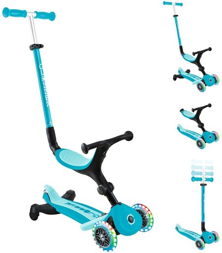 Go-Up Active Lights 360 fra Globber er den ultimative 3-i-1 scooter til småbørn og børn. Denne oplyste sammenklappelige trehjulede scooter med sæde vokser med barnet og forvandles ubesværet til en trehjulet cykel, løbecykel eller scooter. Tilstandene "Mount" og "Run" er perfekte til småbørn i alderen 15 til 36 måneder, mens Scooter-tilstanden vil glæde børn fra 3 år og derover. TPR-sædet kan justeres i højden på 2 måder og kan justeres uden værktøj med et tryk på en knap. Styret er 4-vejs højdejusterbart. Go-Up Active Lights 360 er udstyret med et ekstra dybt forstærket og skridsikkert kompositdæk, der understøtter op til 50 kg. Den har batterifrie LED-pærer af høj kvalitet i de 120 mm støbte PU-forhjul, som blinker i rødt, grønt og blåt og er monteret på ABEC 9-lejer. Derudover er der et 80 mm baghjul lavet af støbt PU, som er udstyret med en innovativ 360° styremulighed: Dette gør dette børnekøretøj endnu nemmere at styre med en skubbestang. Den optimerede og ekstra brede friktionsbremse bagtil sikrer pålidelig bremsning, og der medfølger en aftagelig fodstøtte for ekstra komfort og sikkerhed i køretilstand. Med det praktiske foldesystem kan Go-Up Active Lights 360 også nemt transporteres. Styret kan justeres i højden fra 68-83 cm. ...