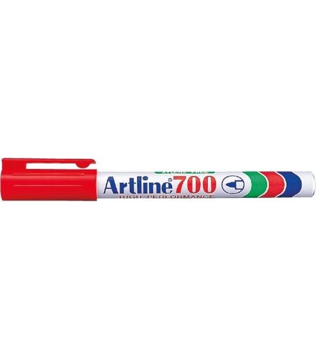 Artline 700 permanent marker i rød - et anerkendt valgArtline 700 er en velkendt permanent marker, som mange anvender som arbejdsredskab hver dag. Markeren har en rund spids, der giver en stregbredde på 0,7 mm. Det gør den god til de mindre opgaver og i hjemmet.Markeren kan skrive på både glas, metal og træ.Artline 700 skriver med et hurtigtørrende blæk, som er vandafvisende og helt fri for xylen. Den kommer med praktisk hætte med clips, så den er let at have med. Med hætte på, triller markeren desuden ikke ned af bordet.Farve: RødStregbredde: 0,7 mmVandfastTørrer hurtigtAkryl fiberspids ...
