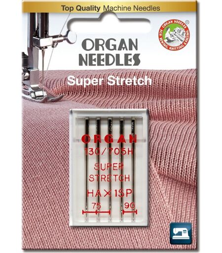 Super Stretch symaskinenåle Med Super Stretch nåle fra Organ får du symaskinenåle i topkvalitet, som passer til alle symaskiner uanset mærke og som kan bruges både til almindelig symaskine og overlocker symaskiner. Kvalitetsnålene kan bruges til syning i vævede og strikkede tekstiler med stretch, som f.eks. jersey, fleece og stof til badetøj og sportstøj. Nålene har en kugleformet spids, som let går igennem stoffet imellem stoffets tråde, hvilket forhindrer at der rives i maskerne så de løber.Du får i alt 5 nåle i størrelserne 3 x 75 og 2 x 90. ...