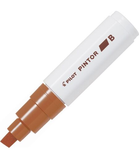 Pintor Classic – kreative DIY markere i fine basisfarver Slip fantasien løs med de farverige Pilot Pintor markere og udforsk dit kreative talent indenfor tegning, farvelægning, dekorering, mærkning, skrivning og kalligrafi. Pintor penne er er de ultimative DIY-penne, som er udviklet og designet til alle former for kreative aktiviteter og projekter. Pilot Pintor markere indeholder pigmentrigt, vandbaseret og hurtigttørrende blæk som har en utrolig god dækkeevne. Den gode dækkeevne og de stærke farvepigmenter sikrer dig de flotteste og klare farver på stort set alle typer overflader, materialer og underlag – også de mørke af slagsen. Brug f.eks. markerne på papir, træ, glas, keramik, plastik, metal og stof. Du får her en marker fra Pintor Classic serien, som består af penne i 6 flotte basisfarver. Basisfarverne tager sig flot ud på mange forskellige overflader og giver et klassisk og farverigt udtryk når du tegner eller skriver. Farve: Brun Spids: Broad, bred 8 mm Stregbredde: 8 mm Vandbaseret blæk Hurtigtørrende God dækkeevne Producentens varenr.: SW-PT-B-BN Inden brug skal Pintor markeren rystes, så du kan høre kuglen bevæge sig inde i hylsteret. Klargør spisen ved at trykke den ned mod et stykke papir 3-4 gange, indtil blækket flyder ud til spidsen. ...