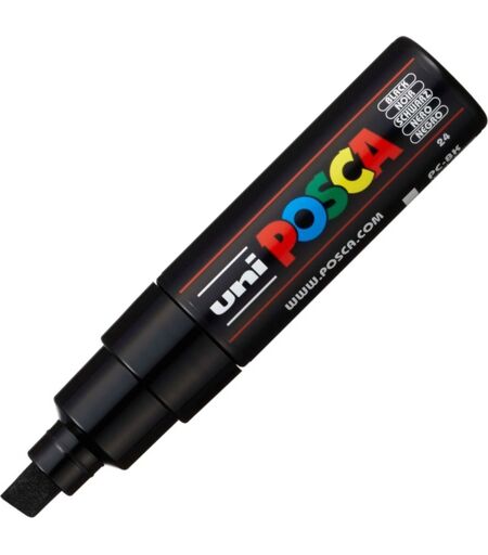 Posca Marker – en kreativ tuschpen uden grænser!Posca er et ikonisk brand, som har skabt kunstneriske kreationer i alle afskygninger verden over, siden 1983. Den ikoniske og revolutionerende tusch indeholder vandbaseret malingsblæk, som er særligt rig på farvepigmenter og som kan bruges på alle typer af overflader. Posca-farverne er meget dybe og intense, og på én gang matte og klare, hvilket giver farverne den imponerende, flotte og magiske Posca-effekt, som alle kreative ildsjæle kender og elsker.Posca tuscher kan bruges til alt fra Street Art til Fine Art i form af illustrationer, graffiti, portrætter og alle former for kreativ customisation og er med til at samle og inspirere både professionelle kunstnere og fantasifulde hobbyentusiaster i alle aldre omkring samme passion – at udfoldes deres kreativitet og lade den få frit løb.Du får her en Posca tusch med en bred skrå spids, som giver dig mulighed for at tegne nøjagtige og flotte kurver med en skrå og en grafisk effekt, samt at farvelægge store overflader. Den brede tuschpen er perfekt til at skabe store ensfarvede flader, markeringer og kreative street-art bogstaver. Den brede marker er det perfekte redskab til kreative kunstnere og professionelle kreatører, til at lægge farver eller udsmykke og dekorere butiksvinduer. Tuschpennen er også perfekt til kreative og passionerede hobbyentusiaster til fremstilling af scrapbøger, DIY kort og dekoration i hjemmet, hvor den kan bruges til at tegne og skrive på f.eks. fotos, glas og tekstil. Dertil kan tuschen også med stor fordel bruges af f.eks. surfere og skatere, til at customisere deres bræt, samt kreative DIY-mennesker der ønsker at shine en kasket eller en T-shirt op.Den unikke og vandbaserede blækformel giver dækkende farver, som er bestandige over tid, da blækket er malingsbaseret og derved lægger sig ovenpå de forskellige overflader og tørrer hurtigt og holdbart op. Alle Posca-farver kan både overlappe hinanden og blandes for at opnå de absolut flotteste farvespil og effekter, som giver uendelige muligheder for kreativ og kunstnerisk udfoldelse på alt fra pap og papir, til sten, træ, metal, glas og plastik, til stof og tekstil – kun fantasien sætter grænser! Bemærk! At blækket virker permanent på porøse underlag, men kan viskes ud på de fleste glatte, ikke porøse materialer. Et godt råd er at bruge en fikserende klar lak, hvis du ønsker at beskytte og bevare dine kreationer på glatte overflader. Farve: SortSpids: Broad (skrå pumpespids)Stregbredde: 8 mmVandbaseret og farveægte malingsblækDækkende og stærke farverKan bruges på alle typer overfladerHurtigtørrende og lugtfriSådan klargør du din Posca markerInden brug skal Posca markeren rystes, så du kan høre kuglen bevæge sig inde i hylsteret. Kuglen sikrer at elementerne i Posca-malingen blandes godt, så blækket får en homogen konsistens, som sikrer en flot og ensartet streg. Spidsen klargøres ved at trykke den ned mod et stykke papir, indtil blækket flyder ud til spidsen. ...