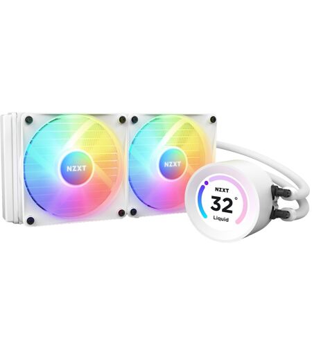 NZXT Kraken Elite 240 RGB er et vandkølesystem med LCD-skærm og F-serie RGB Core blæsere. Kraken Elite leverer cool ydeevne med en skærm, der virkelig bringer individuelt indhold frem. En mere kraftfuld mikrocontroller giver mulighed for mere fordybende tilpasninger såsom lydvisualiseringer og muligheden for at transmittere CAM-information med partikeltæthedsanimationer. En lys 5,99 cm (2,36") vidvinkel LCD-skærm understøtter brugerdefinerede billeder samt animerede GIF''er og tilbyder en krystalklar skærmopløsning på 640x640, dobbelt så meget som den forrige generation. De lyse, lydløse RGB-kerneblæsere i F-serien giver din gamingopsætning et livligt udseende takket være de 8 individuelt adresserbare RGB-LED''er på hver blæser. 7. generation af Asetek-pumpen sikrer, at Kraken Elite køler optimalt ved 2800 omdrejninger i minuttet. Montering forenkles af et enkelt breakout-kabel, hvilket efterlader lidt plads til fejl under installationen. De flydende slanger er beskyttet med forstærket nylonfletning, som giver ekstra holdbarhed og problemfri håndtering. ...