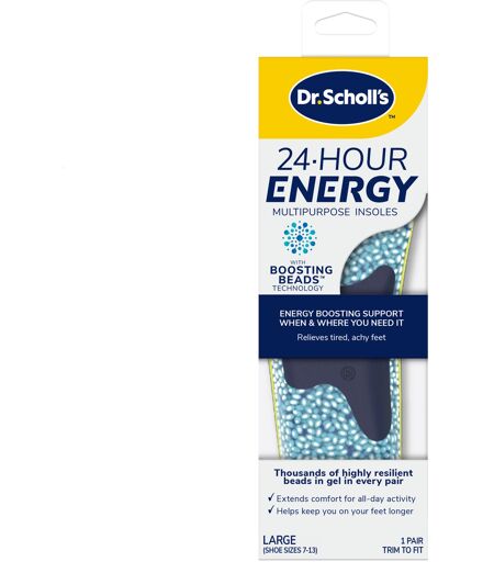 Dr. Scholl's 24-Hour Energy Multipurpose Insoles er specielt designet til folk, der ønsker at bevæge sig mere. Disse indlægssåler hjælper med at lindre trætte, ømme fødder og forhindre ømhed i musklerne i at opstå ved at fordele tryk og returnere energi med hvert skridt - så du føler dig mere energisk hele dagen, hver dag! Ved at bruge verdens første Boosting Beads-teknologi med gel og hukommelse skum, omfavner indersålen hele din fod, så du føler dig, som om du går på små, energiforstærkende bobler. De er drevet af tusindvis af højspændstigt skum Boosting Beads, der er indkapslet i en fleksibel gel, der giver energiforstærkende støtte, hvor og når du har mest brug for det. Med et toplag af Memory Foam-dæmpning, der passer til din fod. I modsætning til enhver anden almindelig sko-indlægssål er 24-timers Energy Multipurpose-indlægssålerne designet til at give mere støtte og energiudbytte. Bær disse indlægssåler i enhver sko, mens du går, løber eller træner - eller endda bare for at hjælpe dig med at holde dig på fødderne, mens du kommer igennem din daglige to-do-liste. Klinisk bevist at give langvarig komfort og reducere træthed, selv på din længste dag. Farvel trætte, ømme fødder - Hej 24-timers energi! ...
