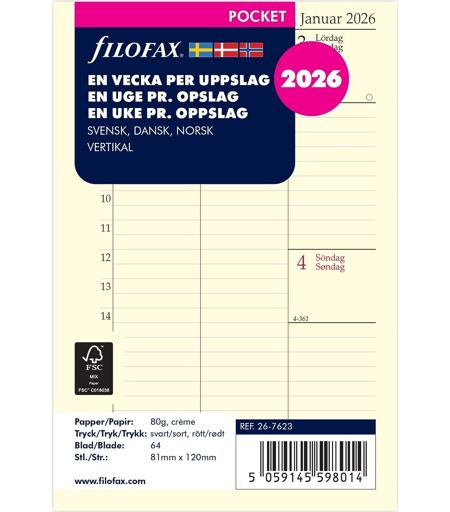 Hold styr på din uge – dag for dag – med denne praktiske ugekalender i højformat fra Filofax. Refillen giver dig det fulde overblik over ugens aftaler og gøremål i en lodret layout, som gør det let at planlægge time for time. Den kompakte størrelse passer perfekt i tasken og er skræddersyet til Filofax kalenderomslag i Pocket-størrelse. De vigtigste fordele Ugeoversigt i lodret layout – ideel til detaljeret planlægning Kompakt format – nem at have med overalt Sprog: Svensk, dansk og norsk – tilpasset skandinavisk brug Letlæseligt design med cremefarvet papir og tydeligt tryk God til planlægning på farten Denne refill giver dig struktur og fleksibilitet på samme tid. Med et opslag pr. uge og tydelige tidsintervaller får du et professionelt layout i handy format. Velegnet til både job og privat. Specifikationer Layout: Uge pr. opslag, lodret Format: Pocket (81 x 120 mm) Antal blade: 64 Papir: 80 g, cremefarvet Tryk: Sort og rød Sprog: Svensk, dansk, norsk Kompatibel med Filofax kalenderomslag Pocket størrelse ...