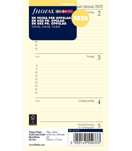 Filofax 2025 Refill Personal Uge Tværformat
