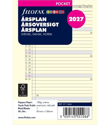 Få styr på aftalerne med en Filofax refill Filofax Refill Pocket Årsplan passer lige i Filofax Pocket kalender, så du kan blive klar til 2027. Med denne refill får du en årsplan, som kan foldes ud, så du har en vertikal oversigt over årets måneder. Dette giver et praktisk overblik over dine private aftaler såvel som deadlines på jobbet i løbet af året. Årsplanen er et godt tilkøb til din pocket 2027 kalender. Den har en høj kvalitet, så den kan kan holde til at blive brugt hver eneste dag året rundt. Med en Filofax refill er du sikret kvalitet for alle pengene og at der er styr på dine aftaler. Årsplan Gælder for året 2027 Gælder fra 1/1-2027 til 31/12-2027 Refill til pocket kalenderomslag Pocket format: 8,1 x 12 cm Papirkvalitet: 100 g ...