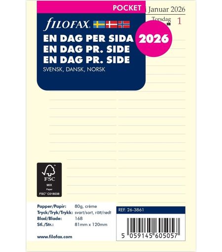 Få overblik og ro i hverdagen med denne daglige refill til din Filofax Pocket kalenderomslag. Hver dag har sin egen side, hvilket giver dig god plads til både aftaler, to-do’s og små noter – uanset hvor travlt du har. Layoutet er enkelt og overskueligt, så du hurtigt kan finde dagens plan og tilføje nye punkter i takt med, at ugen skrider frem. Det kompakte format gør det let at have kalenderen med på farten – ideel til dig, der planlægger dag for dag. De vigtigste fordele Én dag pr. side – rigeligt skriveplads til hele dagens opgaver Kompakt pocket-format – nem at have med overalt Kalender på svensk, dansk og norsk Tydelig datering med ugenumre og helligdage Elegant layout med diskrete farver og letlæselig typografi Perfekt til kompakt planlægning Denne refill er til dig, der ønsker en fleksibel og mobil kalenderløsning – uden at gå på kompromis med struktur. Formatet er ideelt til daglig brug i en travl hverdag, og passer naturligvis til dit Filofax Pocket kalenderomslag. Specifikationer Format: Pocket (81 x 120 mm) Opslag: En dag pr. side Sprog: Svensk, dansk og norsk Antal blade: 168 Papir: 80g cremefarvet Tryk: Sort og rød Kompatibel med: Filofax kalenderomslag Pocket størrelse ...