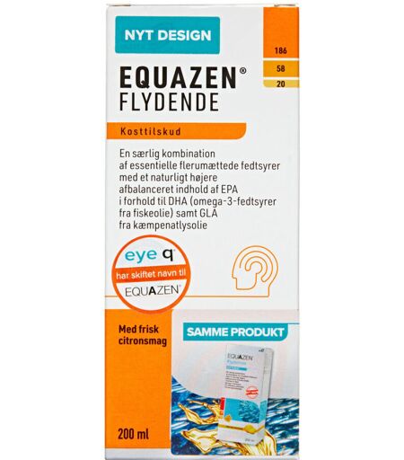 Equazen Flydende er et kosttilskud med en særlig kombination af essentielle flerumættede fedtsyrer med et naturligt højere afbalanceret indhold af EPA i forhold til DHA (omega-3-fedtsyrer fra fiskeolie) samt GLA fra kæmpenatlysolie. Et dagligt indtag på 250 mg DHA bidrager til at vedligeholde en normal hjernefunktion. Produktet er med frisk citronsmag. Dispenseringsform Flydende Dosis og Anvendelse Anbefalet daglig dosis til børn fra 3 år og voksne: For at opnå det bedste resultat anbefales det at starte med 1 teskefuld (5 ml) 3 gange dagligt i 12 uger. Derefter kan dosis reduceres til 1 teskefuld (5 ml) dagligt. Alternativt kan man starte med 5 ml dagligt og øge 3 x 5 ml over 2-3 uger for at undgå eventuel løs mave. Indtag ikke højere dosis end den anbefalede daglige dosis. Omrystet før anvendelse. Anvendes senest 3 måneder efter åbning og inden udløbsdatoen. ...