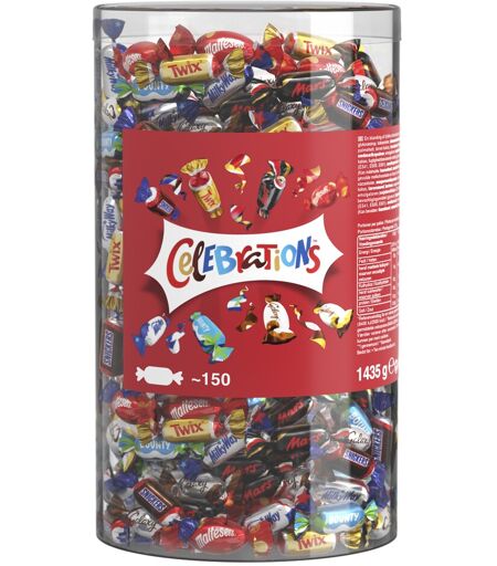 Celebrations små chokolader er 1,435 kg lækker chokoladeblanding Skab glæde med disse små chokolader! Bøtten indeholder alle de populære chokoladebarer, som milky way, Mars, Twist, Bounty og Snickers i miniatureform. Celebrations er den perfekte bøtte chokolade at købe til festen, fødselsdagen eller blot til en forkælelse af medarbejderne på storkontoret. Cylinderen består af 1,435 kg chokolade. Ca. 150 stk. Snickers chokolader – fyldt med karamel, peanuts og nougat, samt overtrukket med et tykt lag mælkechokolade. Snickers blev lanceret i 1930, og i dag er den stadig en favorit hos mange. Mars chokolader – med karamel og chokolade er de én af de største ”chokoladesucceser” i verden.Twix chokolader – med blød karamel, knasende sprød kiks og lækker chokolade.Bounty chokolader – paradis i chokoladeform. Saftig og velsmagende kokos indhyllet i et tykt lag mælkechokolade.Milky way - består af blød nougatcreme med herlig mælkechokolade rundt om.Maltesers - chokolade med sprøde og luftige maltkugler.Galaxy - ren mælkechokolade og mælkechokolade med karamelfyld. ...