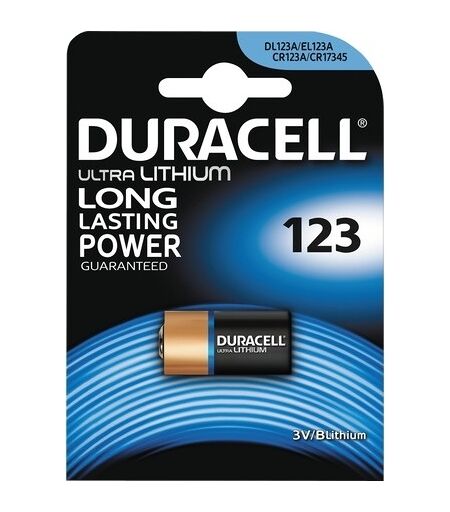 Duracell 123, DL123A, CR123A, EL123A, IEC: CR17345 Kemisk system: Lithium/MnO2 Volt: 3,10 Kapacitet mAh: 1400 Dimension mm inkl kontakter: 16,9*34,5 ...