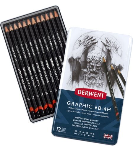 Derwent Graphic GrafitblyanterDerwent Graphic er en serie af profesionelle grafitblyanter produceret i den anerkendte høje Derwent kvalitet. Blyanterne fås i sæt med en bredt spektrum af hårdheder, så du er forberedt uanset hvilken tegne- og skitseopgave, som du laver. Indeholder 12 grafitblyanter i hårdheder fra 6B-4HLeveres i en flot metalæskeDen stolte historie om engelskproducerede blyanter går helt tilbage til 1832. Allerede i 1938 producerede Derwent den første farveblyant, og lige siden har Derwent haft fuldt fokus på at producere kunstnerartikler i ekstraordinær høj kvalitet og med et konstant øje på innovation. I generationer har Derwent, verden over, været mange kunstneres foretrukne mærke. ...