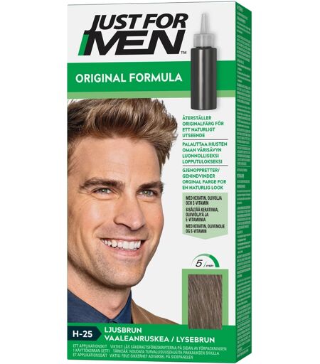 Just For Men Hair Colour er en permanent hårfarve til mænd, som har til formål at dække alle grå hår, samtidig med at den sikrer et naturligt og fyldigt resultat. Når du vælger Just For Men Hair Colour, vælger du en revolutionerende løsning, der blot tager 5 minutter at farve hvert eneste grå hår, og farven holder indtil de grå hår vokser ud igen . Den avancerede teknologi arbejder i harmoni med dit hårs naturlige pigment, hvilket skaber et naturligt resultat uden synlige farvestreger eller kunstige nuancer - denne farve er designet til at blende ind i dit eksisterende hår og skabe en markant forvandling. Formlen er beriget med keratin, olivenolie og E-vitamin, som er plejende ingredienser, der nærer og hydrerer dit hår, så det ser sundt og velplejet ud. Oplev den magiske kombination af selvtillid, stil og en ungdommelig udstråling, som Just For Men Hair Colour kan give dig, og glem alt om dyre salonbesøg eller timer brugt på at vente i kø – med Just For Men Hair Colour får du en øjeblikkelig makeover, der passer ind i din travle hverdag. Sættet indeholder: 1 stk. Farvebase 27,5 ml 1 stk. Farvefremkalder 38,5 ml 1 par Engangshandsker 1 stk. Brugsvejledning Fordele: Hårfarve til mænd Dækker grå hår Holder indtil de grå hår vokser ud Giver et naturligt resultat Får håret til at se fyldigere ud Ammoniakfri Anvendelse: Læs og følg altid brugsvejledningen meget nøje Hæld farvebasen ned i applikatorflasken med farveudvikleren Ryst flasken grundigt for at blande produktet. Knæk spidsen af (vær opmærksom på, at der kan opstå tryk) Påfør blandingen i små portioner og fordel den jævnt på de ønskede områder. Start der hvor håret er mest gråt og fortsæt til resten af håret Massér godt ind med fingrespidserne og lad det sidde i præcis 5 minutter, ellers bliver håret mørkere end forventet Skyl grundigt under bruseren ...