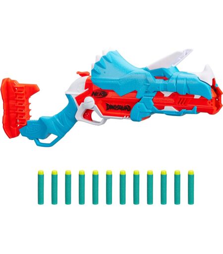 Slå dig sammen med legendariske dinosaurer som et medlem af DinoSquad-eliten! Lær at tøjle dinosaurernes ekstraordinære kræfter, og blast din vej gennem fantastiske eventyr! Kast dig ud i 3-pils-action med Nerf DinoSquad Tricer-blast! Den har et sejt dinosaurdesign inspireret af en triceratops. Åbn blasteren for at lade den ved at trykke på det forreste horn på dinosaurens hoved, hvorved løbet svinger ned, og pilekammeret kommer til syne. Læg 3 pile i, og luk løbet igen. Træk hanen ned for at lade blasteren, og tryk på udløseren for at sende en pil af sted mod dit mål. Der er plads til 12 pile i skæftet, så du altid har ekstra ammunition til genladning lige ved hånden. Inkl. 12 officielle Nerf Elite-skumpile, der er testet og godkendt for ydeevne og kvalitet. Beskyttelsesbriller anbefales (medfølger ikke). Der kræves ikke batterier. Nerf og alle relaterede betegnelser er varemærker, der tilhører Hasbro. ...