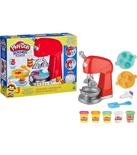 Med superfoodprocessoren fra Play-Dohs æltekøkken kan små lerkonditorer fra 3 år fremtrylle fantasifulde kager, cupcakes eller småkager fra spartelmasse. Der er to vedhæftede filer, der kan indsættes i den aftagelige skål. Nu kan hver form fyldes med legekitt - så skal du blot flytte håndtaget for at stemple sjove småkager og gode kagedåser. Med æltesprøjten kan æltningskreationerne dekoreres, og med hullerne på håndtaget på dejskraberen skabes drys til dekoration. Formene på siden af foodprocessoren kan bruges til at lave slik, toppings og endnu mere pynt fra Play-Doh. Dette legesæt indeholder i alt 284 gram legekitt i forskellige farver. ...