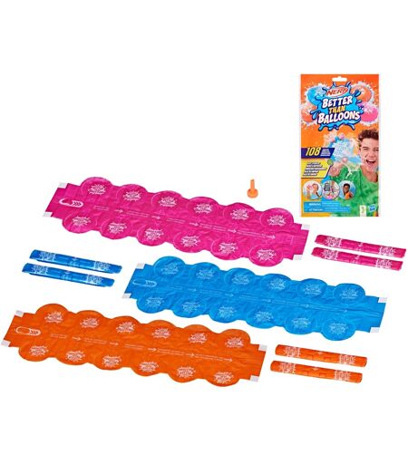 Mærket "Nerf Better Than Balloons" er alternativet til vandballoner og tilbyder god vandlegesjov! De farvede vandkapsler er enkle på alle måder. Deres innovative design giver mulighed for hurtig påfyldning og nem indsamling. Under spændende vandaction er de nemme at holde i hånden og briste ved stød. Nerf Better Than Balloons vandkapsler forbliver i ét stykke, når de brister, så de hurtigt kan tages op efter leg. Dette eliminerer behovet for at søge efter de mange små dele, der gør oprydning efter leg med vandballoner så kedelig! Vandkapslerne er opstillet på et ark og kan let adskilles. Takket være design og materiale er de nemme at fylde. Indeholder i alt 108 vandkapsler på 9 ark og en genanvendelig dyse. Takket være de enkelte ark kan du vælge, hvor mange du vil bruge. Bare fyld et par ark eller brug dem alle på én gang! ...