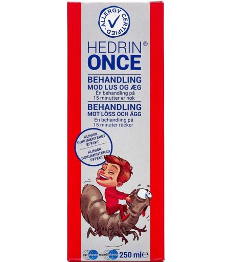 Hedrin Once er et effektivt middel til at dræbe hovedlus og deres æg ved en behandling på 15 minutter. Anvendes til at dræbe hovedlus og deres æg hos voksne og børn over 6 måneder. Dosis og Anvendelse Dæk skuldrene med et håndklæde.Ryst flasken grundigt før brug, fordel Hedrin Once jævnt i tørt hår. Vær sikker på at håret er helt gennemvædet, så hovedbunden og håret er helt dækket med Hedrin Once.Gnid Hedrin Once ind i håret med fingrene eller en almindelig kam, så produktet spredes fra hårrod- til spids.Hedrin Once skal sidde i håretDa Hedrin Once er vandskyende er det vigtigt at påføre shampoo i håret inden håret gøres vådt. ...
