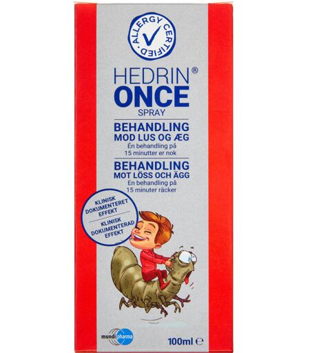 Hedrin Once Spray Gel er yderst effektiv til behandling af hovedlus og æg hos voksne og børn. Hedrin Once virker ved fysisk at dræbe lusene. Bemærkning Må kun bruges til voksne og børn over 6 månederOpbevares utilgængeligt for børnKun til udvortes brugBruges inden for 12 måneder efter åbningenOpbevares ved max 25 grader celcius Dosis og Anvendelse Dæk skuldrene med et håndklæde.Ryst flasken grundigt før brug.Hold sprayen ca. 10 cm fra håret, og spray omhyggeligt Hedrin Once i TØRT hår. Vær sikker på, at håret er helt gennemvædet, så hovedbunden og håret er helt dækket med Hedrin Once.Pas på ikke at spraye i øjnene og ansigtet, og indånd ikke den forstøvede væske.Gnid HedrinOnce ind i håret med fingrene, så det spredes jævnt fra hårrod til spids.Brug ikke en kam eller børste, når Hedrin Once fordeles i håret, eller mens produktet er i håret.Hedrin Once skal blive i håret i 15 minutter. Brug ikke føntørrer.Håret må ikke tildækkes med fx et håndklæde eller en badehætte.Når Hedrin Once skal vaskes ud, kommes SHAMPOO DIREKTE I HÅRET, før håret gøres vådt. Vær sikker på, at håret er helt dækket med shampoo, da Hedrin Once er vandskyende.Vær opmærksom på, at Hedrin Once ...