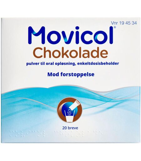 Movicol Chokolade er et afføringsmiddel, der bruges til at behandle kronisk forstoppelse. Movicol Chokolade blødgøre afføringen og gør det lettere at tømme tarmen, så forstoppelse lindres. Movicol Chokolade hjælper også med at opløse hård, indeklemt afføring. Movicol Chokolade bør ikke gives til børn under 12 år uden lægens anvisning. I pakningerne med medicin findes en patientvejledning, som du altid bør læse grundigt, inden du tager medicinen. Hvis du er i tvivl, om du må bruge medicinen, bør du kontakte egen læge. ...