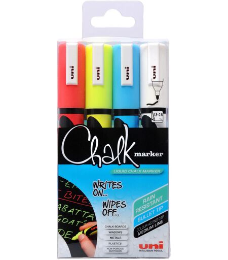 Uni Chalk Marker PWE-5M , 4 styk 2,5mm Uni Chalk Marker 4 stk. Egenskaber Kan bruges på glatte overflader På glastavler og vinduer Vandfast – skriv/tegn på glastavler som skal stå ude – lad det tørre så kan det tåle regn. Fjernes med en våd klud Skrivehoved i 1,8-2,5mm Farve: Rød, gul, blå og hvid ...